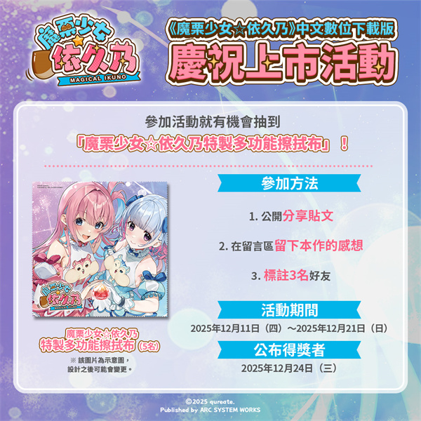 为庆祝《魔栗少女☆依久乃》中文版上市,从今天起举办抽奖活动。公开分享活动贴文并在留言区留下关于本作的感想,就有机会得到「魔栗少女☆依久乃特製多功能擦拭布」。抽奖活动详情如下。
