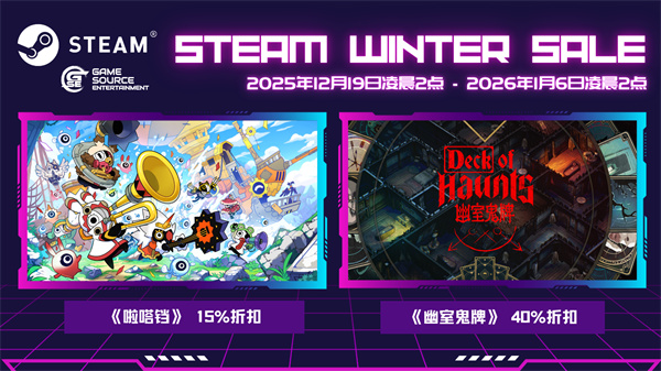 Steam冬季特卖即将开启,《啦嗒铛》和《幽室鬼牌》将限时优惠发售。现在正是入手游戏、体验新内容的最佳时机!