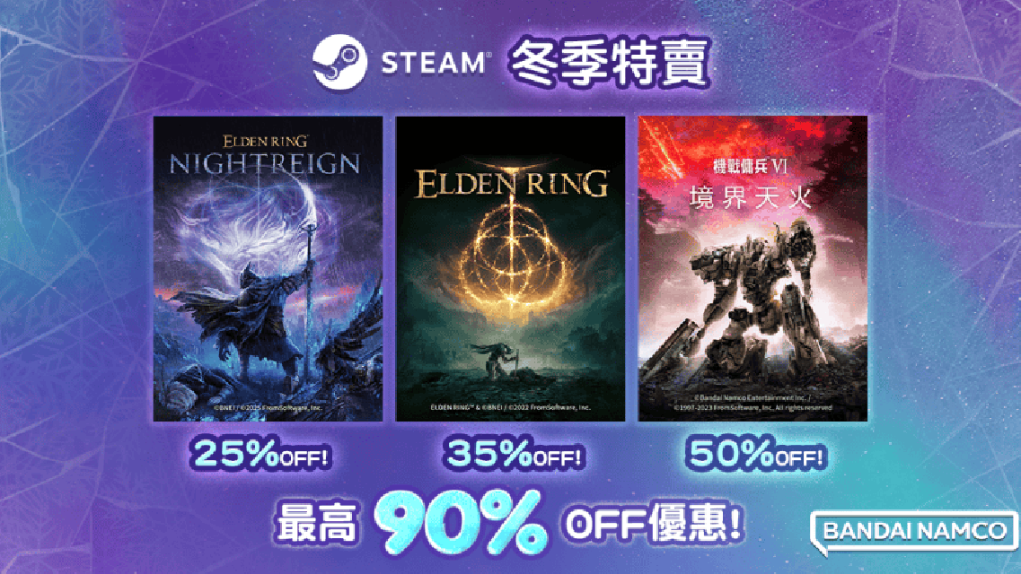 在今年的STEAM冬季特賣中,將由FromSoftware所開發的各作品領軍,包含獲獎無數,可以於廣大世界中盡情探索並挑戰自我極限的動作RPG《艾爾登法環》,擁有獨立世界,需要與其他玩家一同克服極端情境的合作動作生存遊戲《艾爾登法環 黑夜君臨》,以及節奏快速,挑戰以自訂機甲於立體空間展開戰鬥的《機戰傭兵™VI 境界天火™》,都將分別於本次特賣活動中以6.5折、7.5折及5折的超值優惠震撼登場。