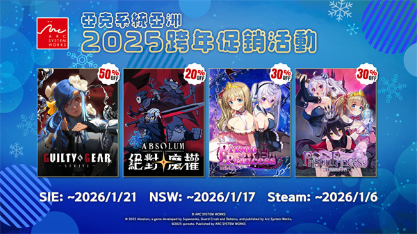 亚克系统亚洲 (ARC SYSTEM WORKS ASIA) 宣布在PlayStation™Store、香港&台湾Nintendo eShop及Steam中进行2025跨年促销活动,并公开在PlayStation®4、PlayStation®5、Nintendo Switch™、Steam®平台中包含《绝对魔权》等多款游戏的促销情报。
