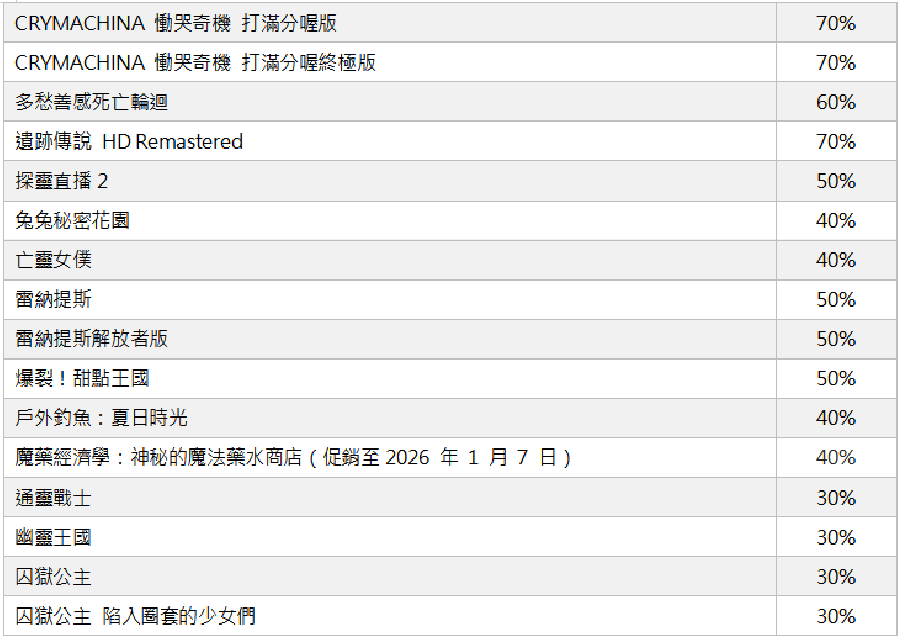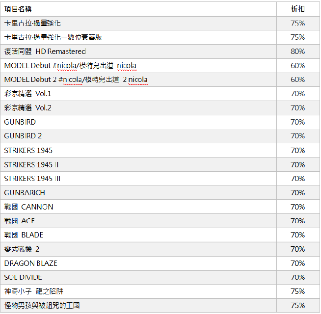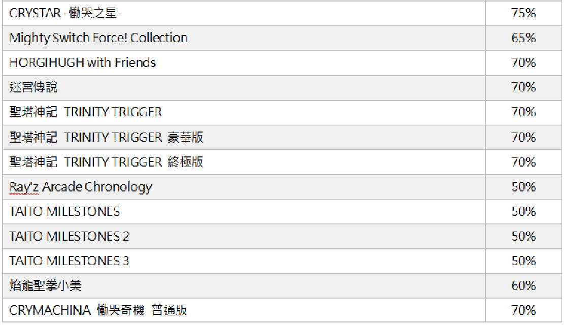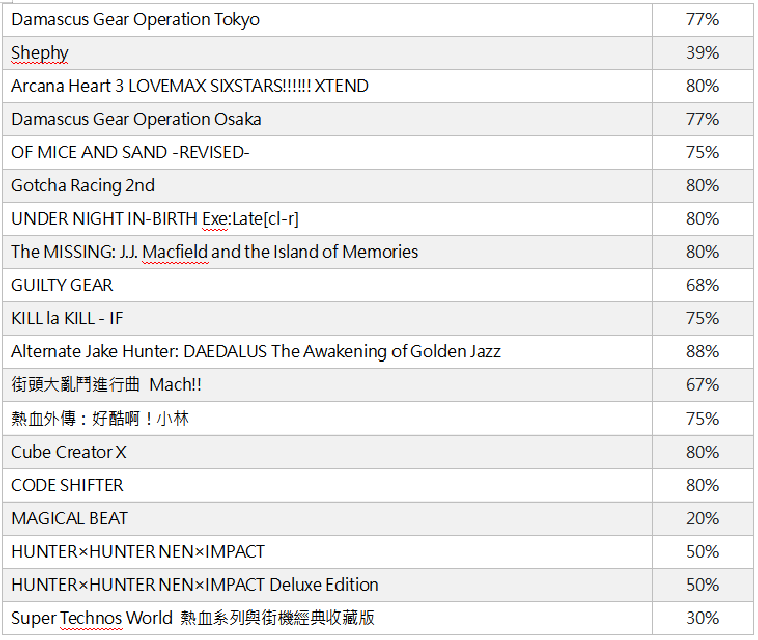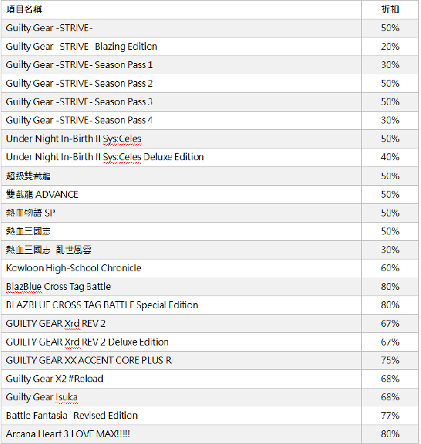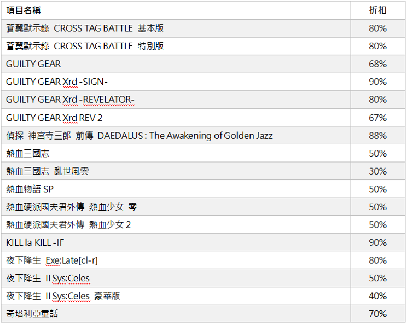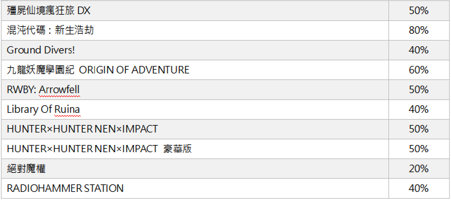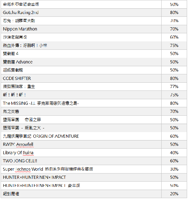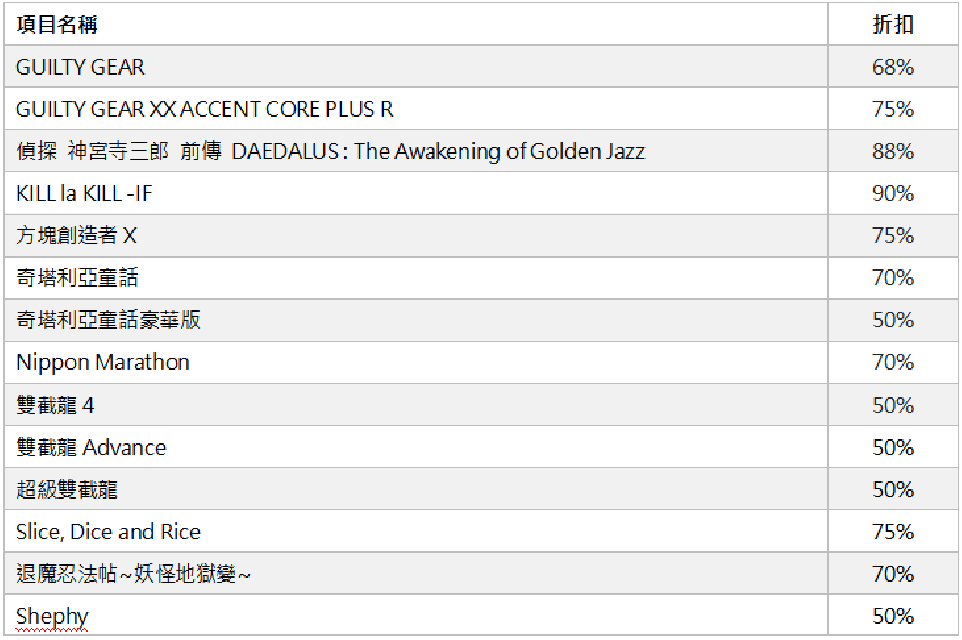 本次促销活动将在各数位商店(PlayStation™Store、香港&台湾Nintendo eShop、Steam)进行,除了有「热血系列」作品之外,以50%Off首次促销的《HUNTER×HUNTER NEN×IMPACT》、20%Off的《绝对魔权》、另外还有《囚狱公主》及《囚狱公主 陷入圈套的少女们》也包含在内。详细促销期间及亚克系统亚洲的促销游戏项目价格资讯如下。