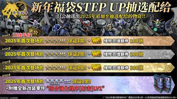 活动期间内,将举办保证获得在2025年中首次登场★3机体的『新年福袋STEP UP抽选配给』,以及所有抽选物资皆为MS,且保证获得两架★3以上MS的「新年红包!10连抽免费特殊抽选配给」。