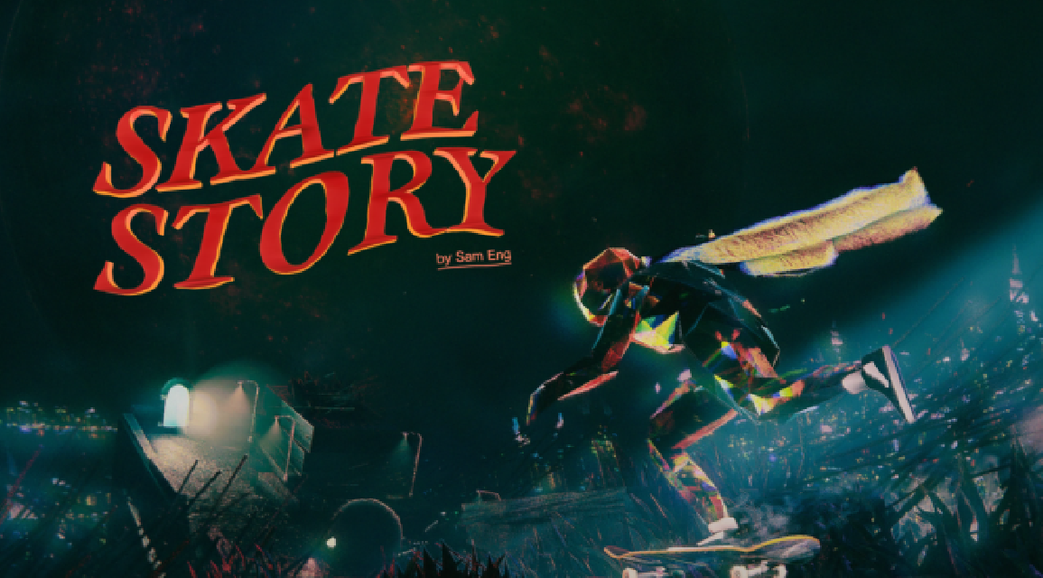 《滑板故事》发生在地狱之中,因为月光剥夺了恶魔们的睡眠,所以主角决定吞下月亮,并为此与魔鬼签下契约,让灵魂绑定了一块滑板,也让身体困于玻璃之中,一次撞击就会让你粉身碎骨:你成为了一个靠着滑板追逐月亮的“玻璃滑板魔”。
