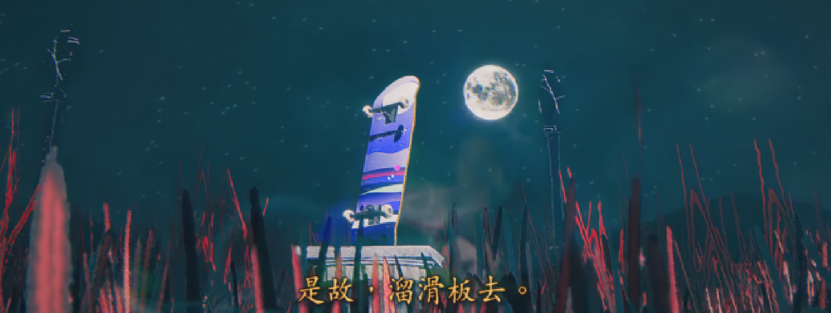 这种“极限运动”和“易碎身体”、“普通双翘滑板”和“穿过地狱追逐月球”的直接矛盾,反而让我感受到了某种和谐。它就像对于滑板运动本身“明知不可为而为之”的宣言:即使这会千百次地令我碎成一地玻璃残渣,我也一样会拎起滑板上路,将一生投入于追逐远在天边的圆月。