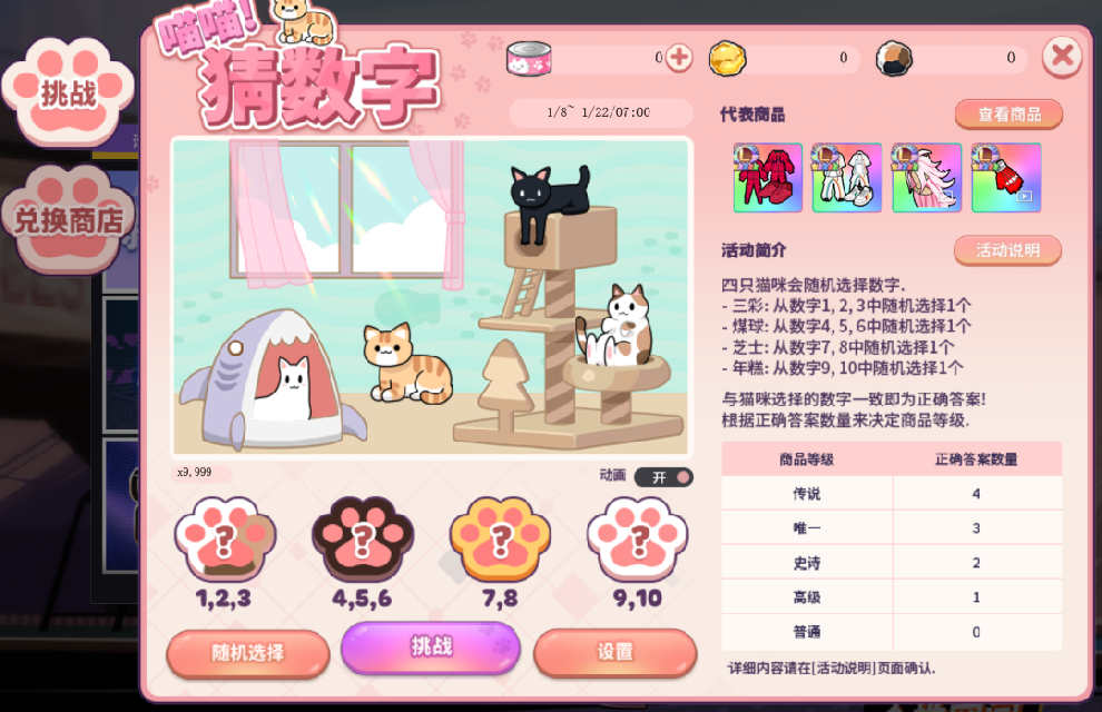 四只猫咪会随机选择数字。