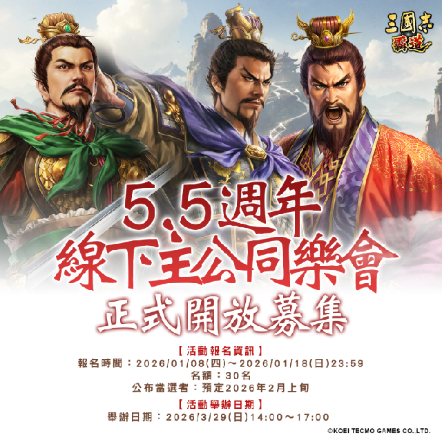 《三国志 霸道》「5.5週年缐下主公同乐会」游戏视频编辑:脆香米2026-01-08 17:45 《三国志 霸道》為迎接即将到来的5.5週年,将举办5.5週年缐下主公同乐会台湾光荣特库摩宣布,由三国志系列之本家光荣特库摩重磅推出MMO