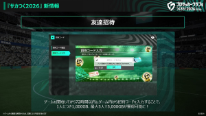 游戏正式上线后,玩家可通过“好友邀请”功能发送邀请码。受邀玩家在开始游戏后的72小时内在游戏内输入邀请码,邀请者即可获得1,000GB。最多可邀请5名好友,获得5,000GB。敬请运用本功能,与好友们一起游玩《创造球会2026》吧!