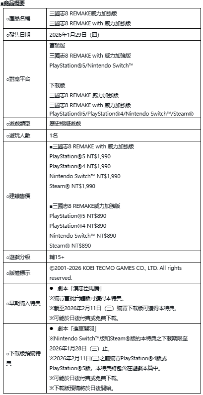 台湾光荣特库摩宣布,纪念「三国志」系列 40 周年的历史模拟游戏『三国志 8 REMAKE with 威力加强版』公布全新剧本、古武将以及新功能的相关情报,以及『三国志 8 REMAKE with 威力加强版』「三国志之日」纪念直播影片(中文字幕)。