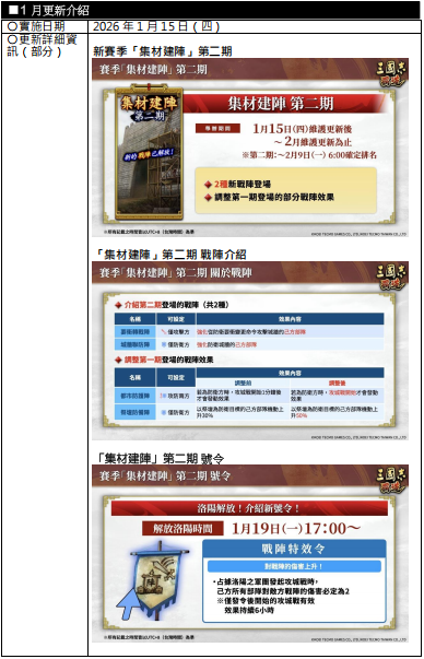 即日起,赛季“集材建阵”第二期开幕。“要衝转战阵”和“城牆联防阵”两种战阵新登场。使用强力的战阵在军团间的争夺中登上顶点吧。