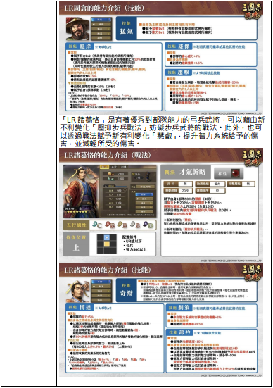 LR 诸葛恪是有著优秀对部队能力的弓兵武将,可以藉由新不利变化“压抑步兵战法”妨碍步兵武将的战法。此外,也可以透过战法赋予新有利变化“慧叡”,提升智力系统给予的伤害,并减轻所受的伤害。
