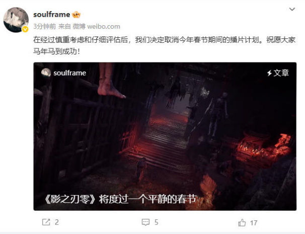 而就在刚刚,游戏制作人梁其伟(Soulframe)发布了文章,表示经过深思熟虑,《影之刃零》团队决定取消原规划的马年春节播片计划。由于距离游戏上线仅剩半年多时间,秉持品质优先于宣发的原则,团队希望将全部资源投入到游戏正式版的研发和打磨之中。