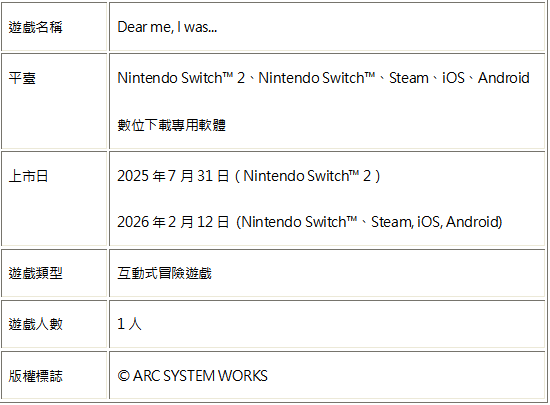 亚克系统亚洲(ARC SYSTEM WORKS ASIA)宣布,Nintendo Switch™ 2专用软体《Dear me, I was...》确定移植至Steam、iOS、Android平台!包含已发表的Nintendo Switch™版本皆将在2026年2月12日(四)上市!