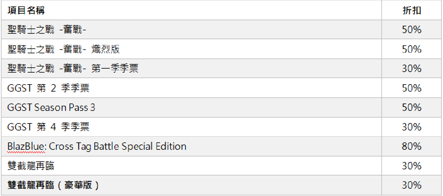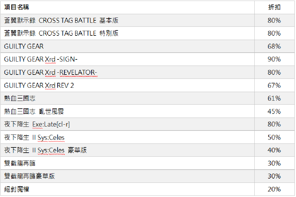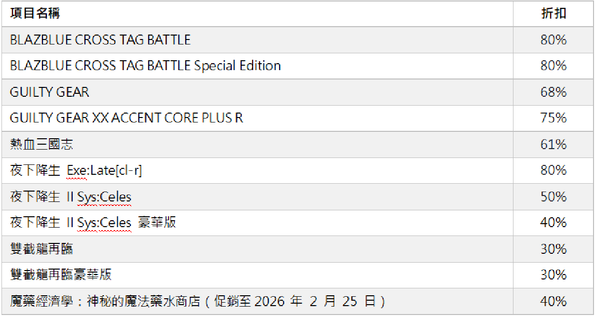 亚克系统亚洲 (ARC SYSTEM WORKS ASIA) 宣布从今天起,在PlayStation™Store、香港&台湾Nintendo eShop、Microsoft Store、Steam及Google Play与App Store中进行2026春节纪念促销活动,并公开在PlayStation®4、PlayStation®5、Nintendo Switch™、Xbox One、Xbox Series X|S、Steam®、Android、iOS平台中的多款游戏的促销情报。