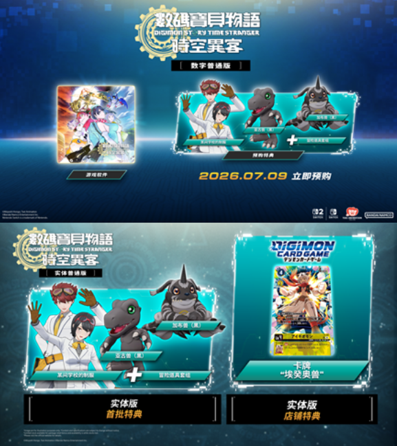 【2026年02月06日】万代南梦宫娱乐宣布,系列作品史上PlayStation®5/Xbox Series X|S/STEAM®版的全球累积销量最快突破100万套的培育型RPG《数码宝贝物语 时空异客》,即将在2026年7月9日推出Nintendo Switch™ 2/Nintendo Switch™版。同步公开最新宣传视频。