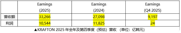 根据韩国国际会计准则(K-IFRS)编制的合并财务报表,KRAFTON 2025年实现营业收入3.3266万亿韩元、营业利润1.0544万亿韩元。全年营收同比增加6,168亿韩元(+22.8%),首次突破3万亿韩元,创公司成立以来新高;营业利润亦再次超过 1 万亿韩元。