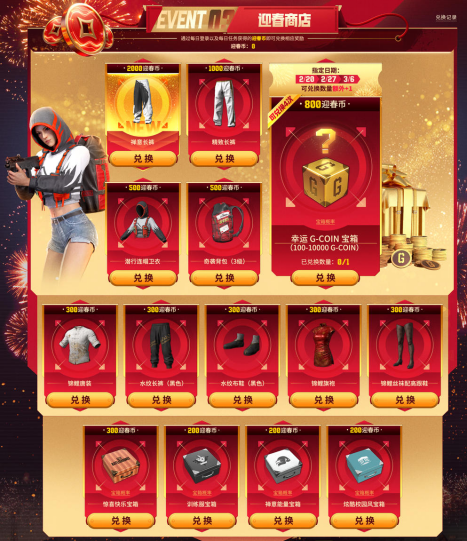 活动3:迎春商店,通过完成每日登录以及每日任务获得的迎春币可在商店兑换奖励,此次有全新的皮肤——禅意长裤上线,另外,活动期间,迎春商店的幸运G-COIN宝箱(100-10000G-COIN)可累计兑换4次,鸡友们千万不要忘记了!