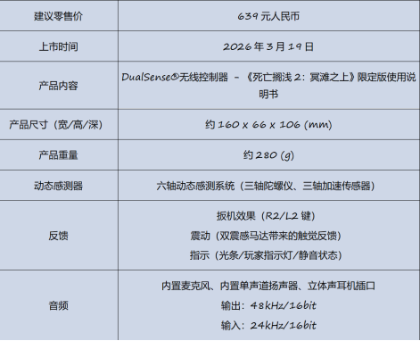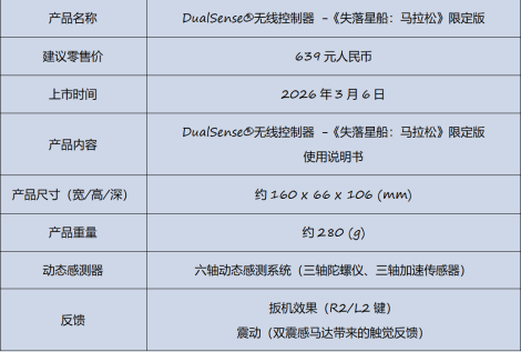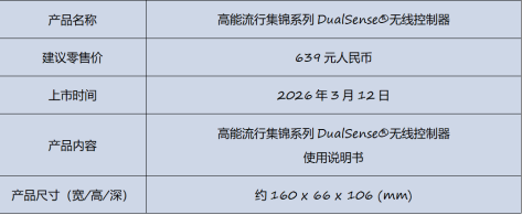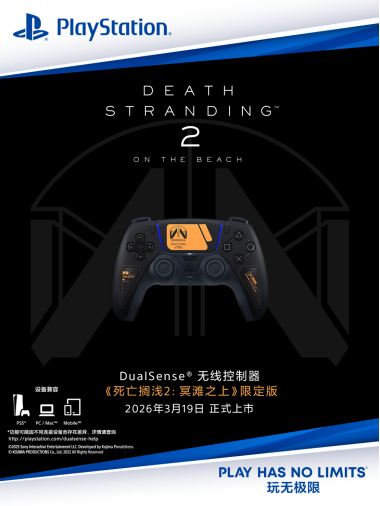 2026年2月27日—索尼互动娱乐(上海)有限公司(以下简称“索尼互动娱乐”)今日正式宣布,PlayStation多款全新配件将于2026年3月陆续在中国大陆上市,更好的满足玩家多样化游玩需求。配件产品包含:DualSense®无线控制器 -《失落星船:马拉松》限定版,3月6日正式上市,建议零售价人民币639元,即日开启预售;高能流行集锦系列DualSense®无线控制器及 PS5™(轻薄版)主机盖将于3月12日上市,建议零售价分别为人民币639元及人民币559元;DualSense®无线控制器 -《死亡搁浅2:冥滩之上》限定版,将于3月12日开启预售,3月19日正式上市,建议零售价人民币639元。