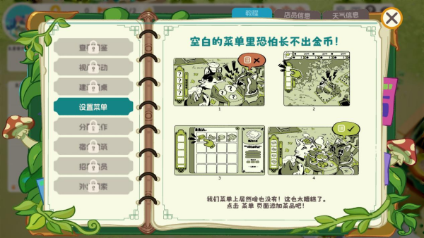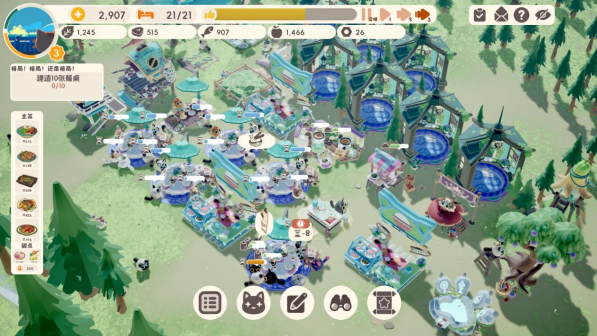 简单来说,作为一款点击模拟经营游戏,《喵喵茶餐厅》需要你建造宿舍、招募员工,再按照不同员工的能力数值选择将其安插在服务员、餐厅、农业生产以及探险队等岗位上并建造足够的餐桌来招待客人。