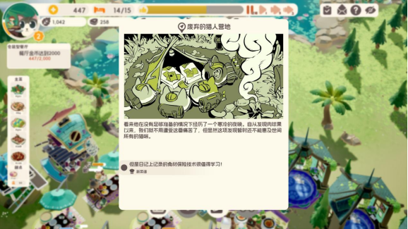 为了推进游戏流程,除了完成主线以及玩家主动领取的额外任务以外,你还需要在探索地图上不停地派出探险队探索周边地点以解锁若干食材采购商场和几条支线剧情,而这些支线则会为你提供几种独特的菜品、建筑以及员工。