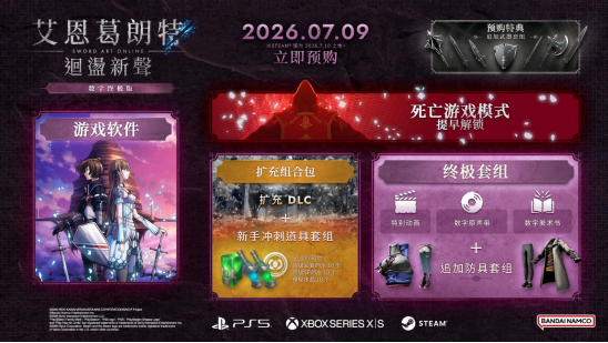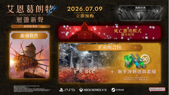 【2026年03月06日】万代南梦宫娱乐宣布,《刀剑神域》家用主机游戏最新作品《艾恩葛朗特 回荡新声》即将在2026年7月9日于PlayStation®5/Xbox Series X|S平台,在7月10日于STEAM®平台上市。同步公开首支宣传视频及特典、版本情报。