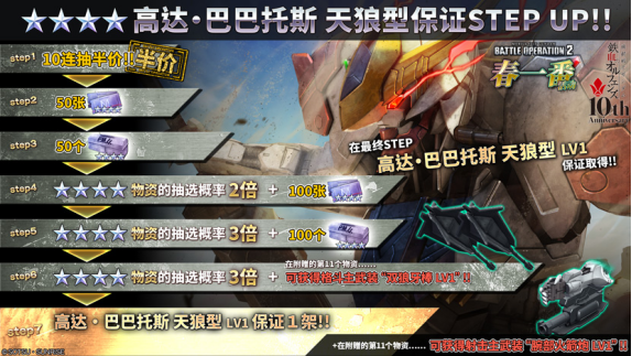 STEP7保证可获得1架「高达・巴巴托斯 天狼型 LV1」以外,在STEP6可获得格斗主武装、STEP7可获得射击主武装。
