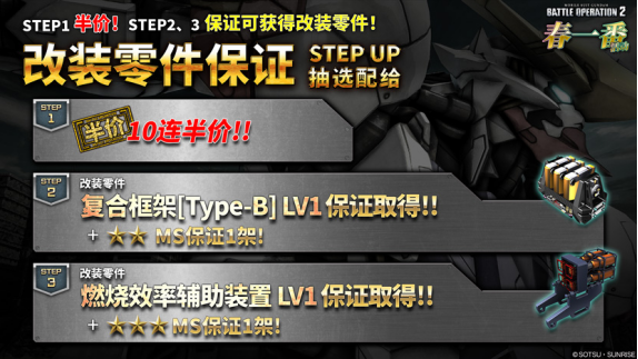 考虑到「高达・巴巴托斯 天狼型」的性能,本次特别精选合适的改装零件:「复合框架[Type-B] LV1」、「燃烧效率辅助装置 LV1」,并保证在STEP2、STEP3获得,请务必一起入手!「高达・巴巴托斯 天狼型保证STEP UP抽选配给」
