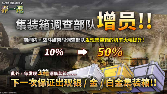 以及集装箱发现率由10%提升至50%、每发现3个铜集装箱,下次必定获得银/金/白金集装箱的「集装箱调查部队增员活动」也同步实施中。