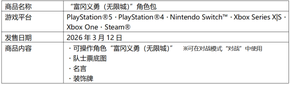 可在对战模式“对战”中解锁使用“富冈义勇(无限城)”的付费DLC“富冈义勇(无限城)”角色包,将于3月12日正式发布。此外,“富冈义勇(无限城)”也可通过购买《鬼灭之刃 火之神血风谭2 角色通行证》解锁使用,该组合包不仅包含“富冈义勇(无限城)”,还收录了“狯岳”、“我妻善逸(无限城)”、“猗窝座(无限城)”、“灶门炭治郎(无限城)”,以及今后预计追加的角色共计7名。