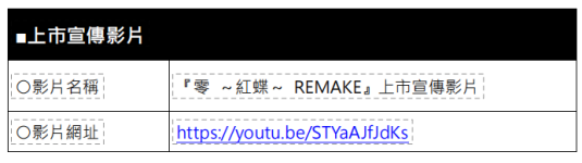 『零 ~红蝶~ REMAKE』上市宣传影片:https://youtu.be/STYaAJfJdKs