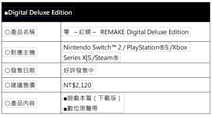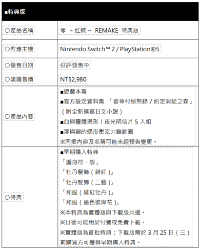 台湾光荣特库摩宣布,和风恐怖冒险游戏『零 ~红蝶~ REMAKE』 (Nintendo Switch™ 2 / PlayStation®5 / Xbox Series X|S / Steam®),已于 今日 2026 年 3 月 12 日(四)正式发售,同步公开上市宣传影片!
