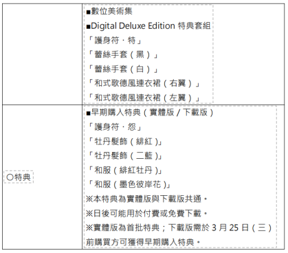 此外,只要购买首批实体版,或于 2026 年 3 月 25 日(三)前购买下载版,即 可获得早期购入特典「护身符・怨」、「牡丹发饰(绯红)」、「牡丹发饰(二 蓝)」、「和服(绯红牡丹)」、「和服(墨色彼岸花)」,敬请把握机会购买。