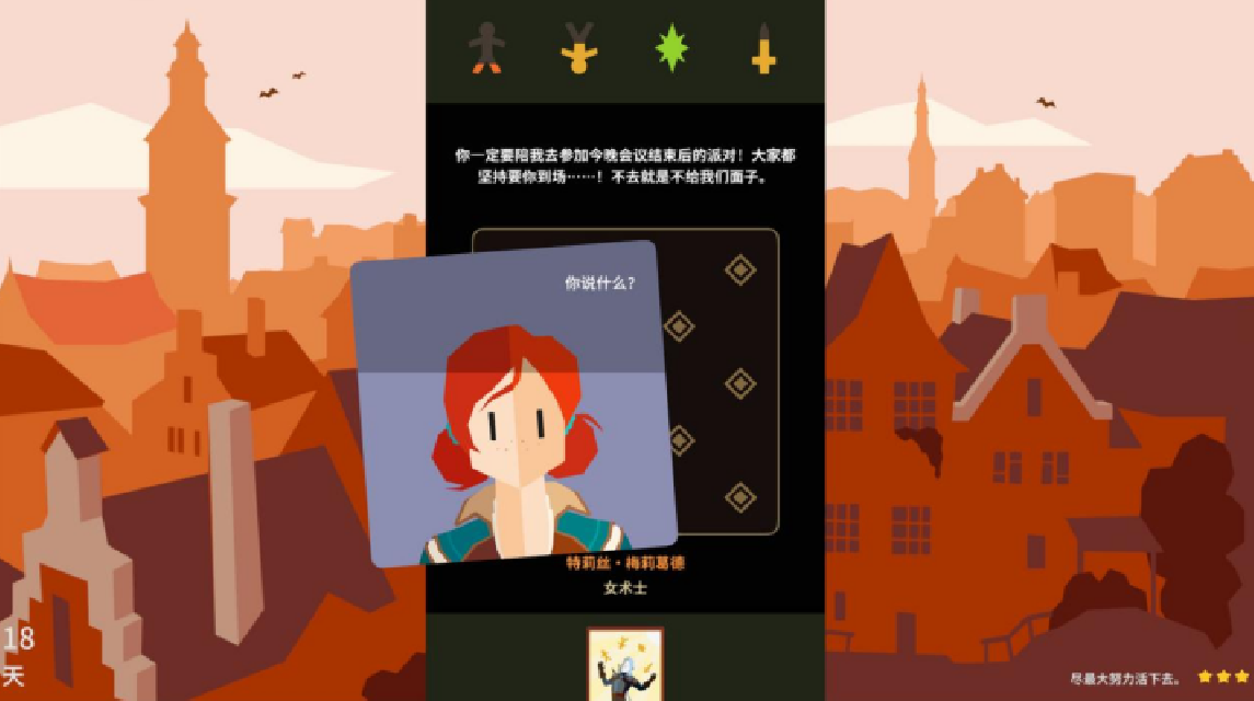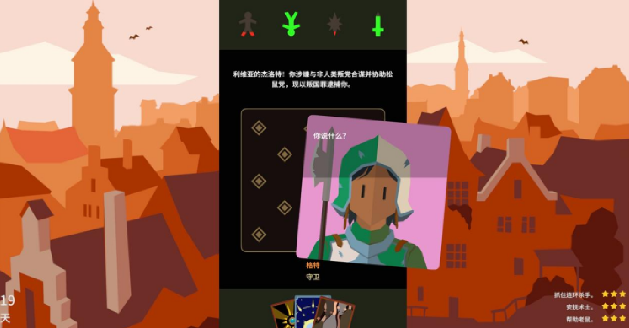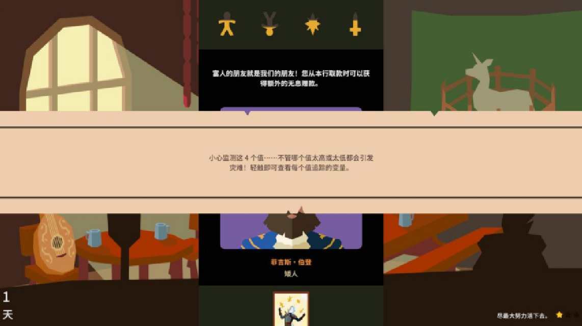 因为作为一个由DD发行的独立游戏,这款看上去像是需要玩家通过一系列双选题治理国家的系列作品,实际上是需要玩家在不知道选项后果的情况下,通过一系列双选题来控制四个不同数值的高低,避免使其过长或过低,并以此尽可能坚持更多的回合数。