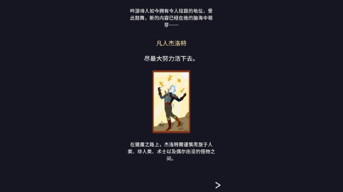 因为它直接将整部作品都设定成了是杰洛特的挚友、吟游诗人丹德里恩在通过胡编乱造在舞台上现场“表演”杰洛特的故事。