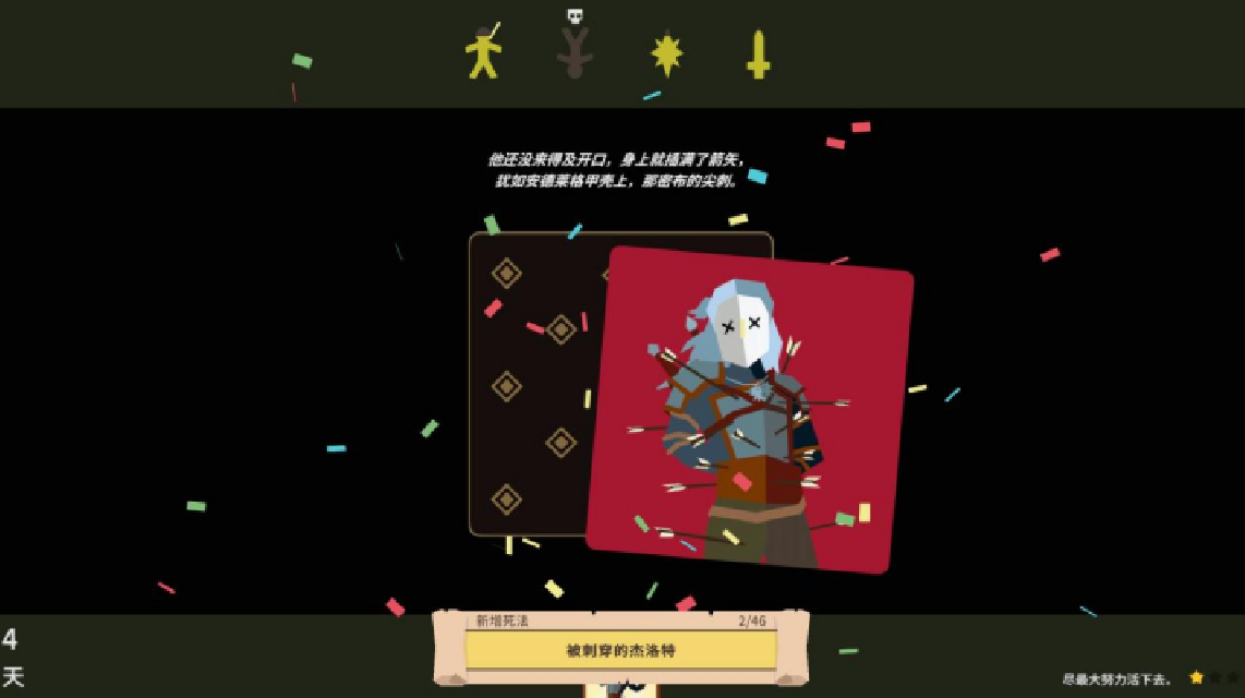 因为游戏的生存压力和策略规划难度并不算小,但本质上,这款需要玩家挑战更久存活时间的系列作品,其实不是要玩家不停地挑战“无尽模式”,而是除了尽可能挑战更高的存活时长以外,你还可以通过更高的局数或更多的死亡来触发、同时也是在图鉴中解锁,更多的人物、事件以及死亡方式。