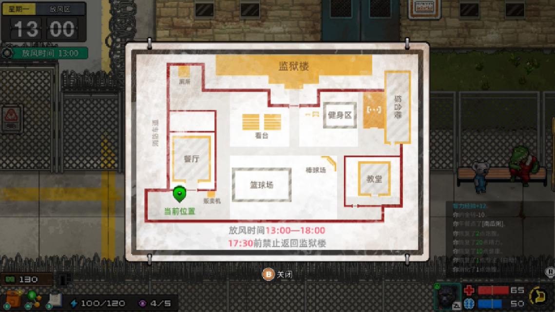 应该说本作的核心是“时间管理”。在游戏中玩家的所有行动(产生交互才算,走路跑图不会计入)都会消耗时间,而监狱的一天是由起床-自由行动-午餐-放风-晚餐-自由行动-宵禁这数个时间段构成的,不同时间段玩家能活动的场景有区别。