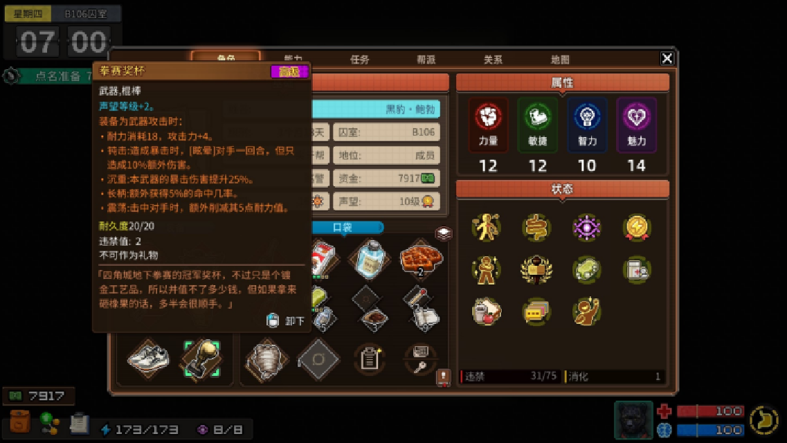 不过《动物迷城》与之相比,虽然都有着极高的自由度,可以在其中利用空闲时间锻炼身体增强属性,耀武扬威;或者在监狱里继续牛马生活,打工挣钱;也能够学习技能、制作工具装备,为最后的逃出监狱作准备;不过说到底,后者是一款沙盒游戏,而《动物迷城》则是偏剧情向的crpg。