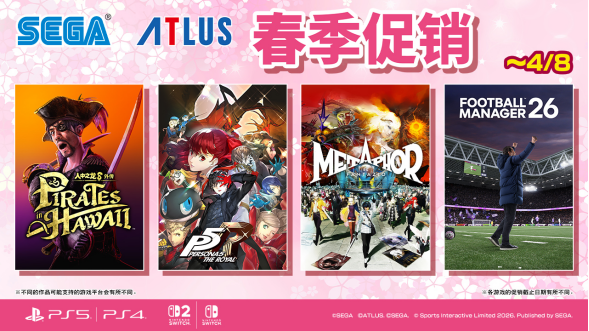 世嘉现正于PlayStation™Store、Nintendo eShop举办“春季促销”活动,部分PlayStation®5/PlayStation®4/Nintendo Switch™/Nintendo Switch™2 游戏以限时特惠价回馈玩家。本次促销将于2026年4月8日结束。