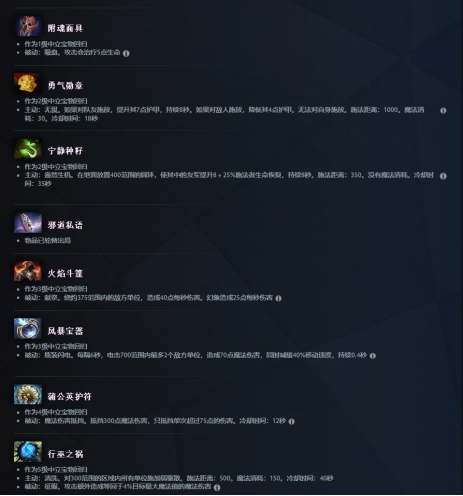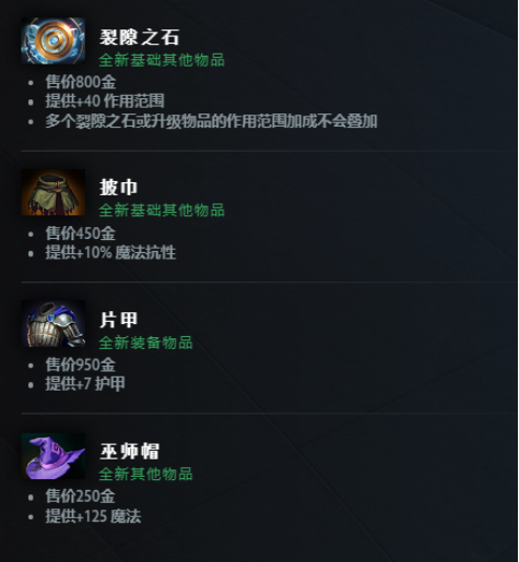全新基础其他物品裂隙之石、披巾、片甲和巫师帽会分别为你提供作用范围、魔法抗性、护甲和魔法值的加成。