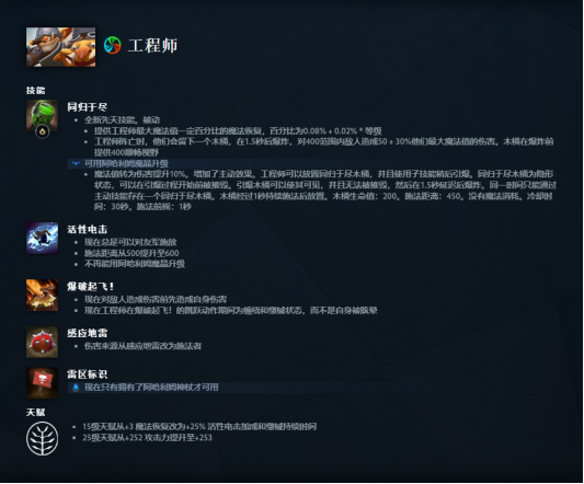 工程师的全新先天技能同归于尽会触发“亡语”效果,工程师阵亡时,他们会留下一个木桶,在1.5秒后爆炸,对400范围内敌人造成50 + 30%他们最大魔法值的伤害。木桶在爆炸前还会提供400顺畅视野。