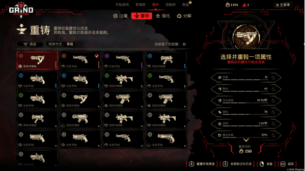 它真正试图做出差异化的地方,则是局外的武器养成。游戏没有把成长只停留在简单的数值解锁上,而是围绕武器构建了一套更复杂的系统:品质、等级、词条、强化、重铸、合成,这些机制叠在一起,让玩家的长期目标不只是“多打一局”,而是“刷出一把更好的武器”。