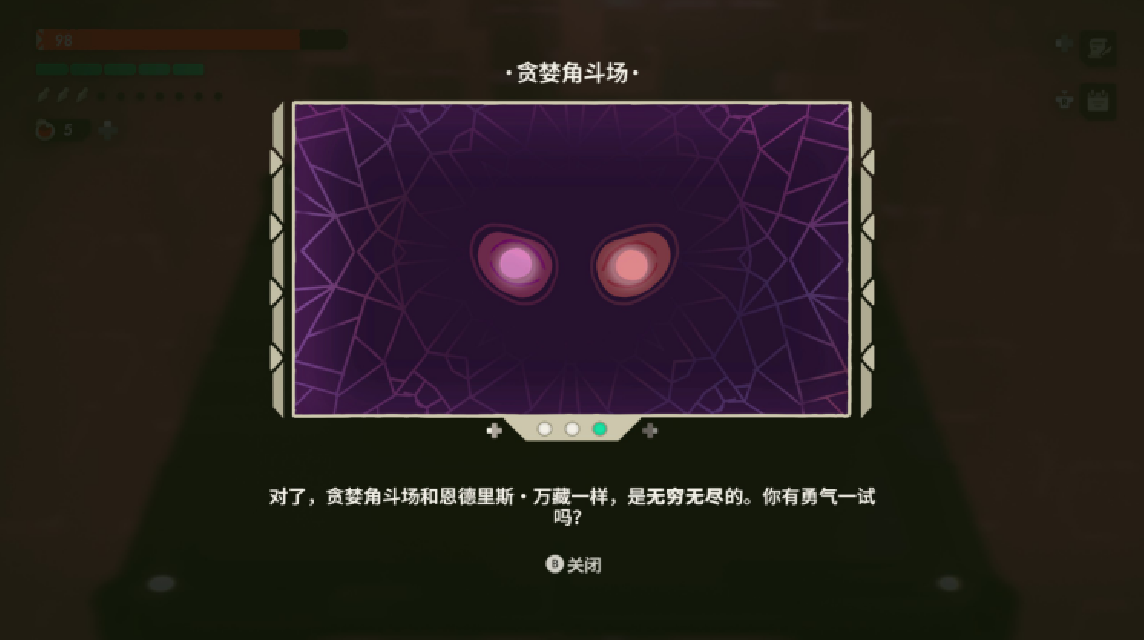此次更新最主要的就是“贪婪角斗场”模式。该模式在游戏完成第五次挑战的主线任务后开启,让玩家在地牢探索打败最终BOSS时,能够选择开启“贪婪角斗场”继续战斗。角斗场中的敌人强度会更高,每三场会迎战一个小BOSS,胜利后可以选择再继续或者退出。