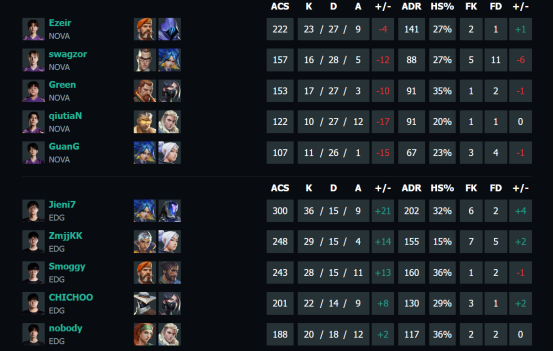 本场比赛,EDG选手nobody在图一达成VCT CN联赛2000总击杀的里程碑,成为当之无愧的焦点人物。Smoggy在裂变峡谷多次贡献关键三杀,ZmjjKK在收官阶段稳定发挥,jieni7回归首秀表现亮眼。