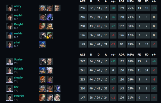 TYL方面,Splash和slowly等选手在图一表现出色,但在后两图中未能延续火热手感。小将yilai在BLG的首秀表现亮眼,多次在关键回合贡献精彩操作。