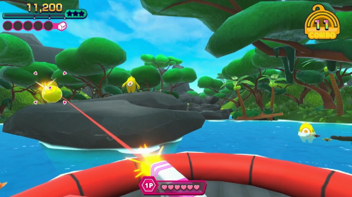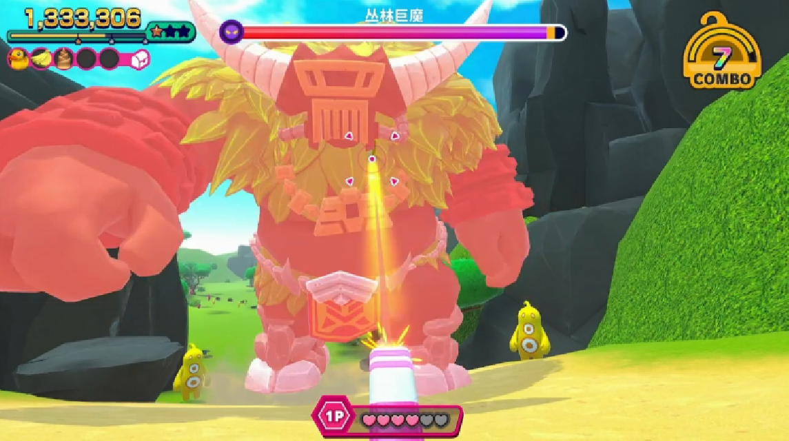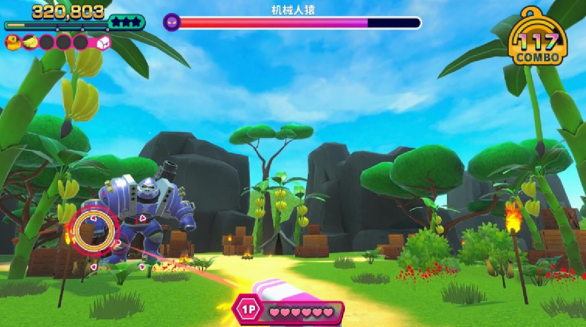 《怪兽帮》的基本设计并不复杂:在流程阶段,敌人大体分为抛掷炸弹的粉色小人,跑向玩家近战的黄色小人以及快速奔逃的高分银色小人,特殊的彩虹小人被击败后会掉落临时强化武器。BOSS阶段,则需要攻击敌人的常驻弱点或通过限时击破光圈造成伤害。