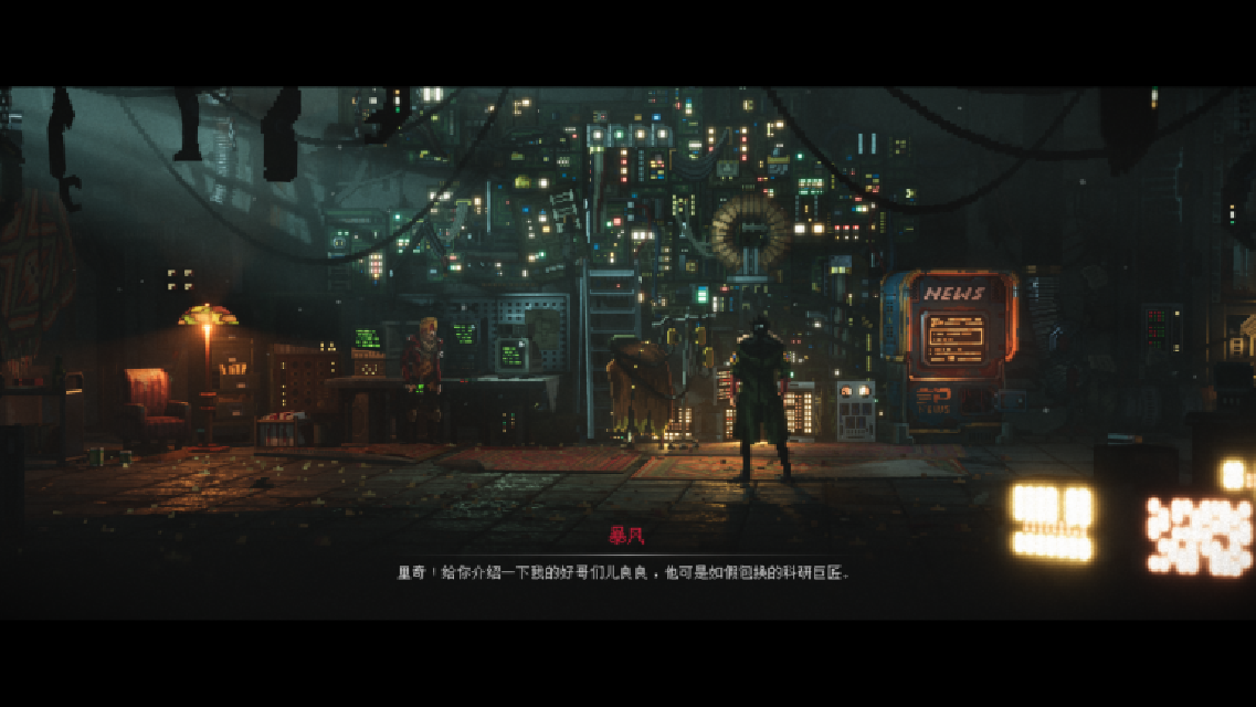 《REPLACED》给我留下了十分难忘的印象,这游戏太有“电影味”了。它不是单纯把像素画得精致,而是做出了电影镜头那种味道。街道上潮湿的反光、霓虹穿过薄雾后的层次、远近景之间的空间感,再加上角色行进时镜头轻微的推拉和转场,整个画面有一种很少见的“活过来”的感觉。