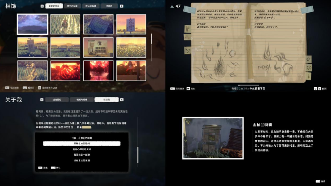 摄影不是附庸风雅的摆设,而是贯穿解谜、推进、观察乃至战斗的系统中枢。笔记本中的关键词整理、线索拼接,也进一步强化了“摄影—理解—前进”的逻辑闭环。它不靠复杂系统堆砌深度,却在机制统一性上展现出相当成熟的完成度。