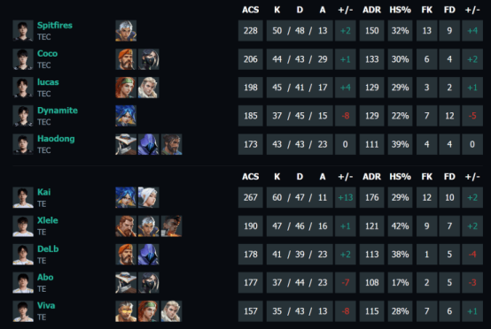 本场比赛TE展现了极强的韧性与临场调整能力。Kai全场火力全开,在图二霓虹町多次贡献关键三杀,在图三决胜局更是豪取五杀ACE,成为TE逆转取胜的头号功臣;Xlele在图三冷静操作三杀完成力克千钧,Viva和Abo也在多个回合中贡献关键发挥。TEC方面,Coco在图三拿下手枪局四杀,Spitfires在决胜局贡献大心脏残局双杀,但整体在决胜图中未能延续首图的统治力。