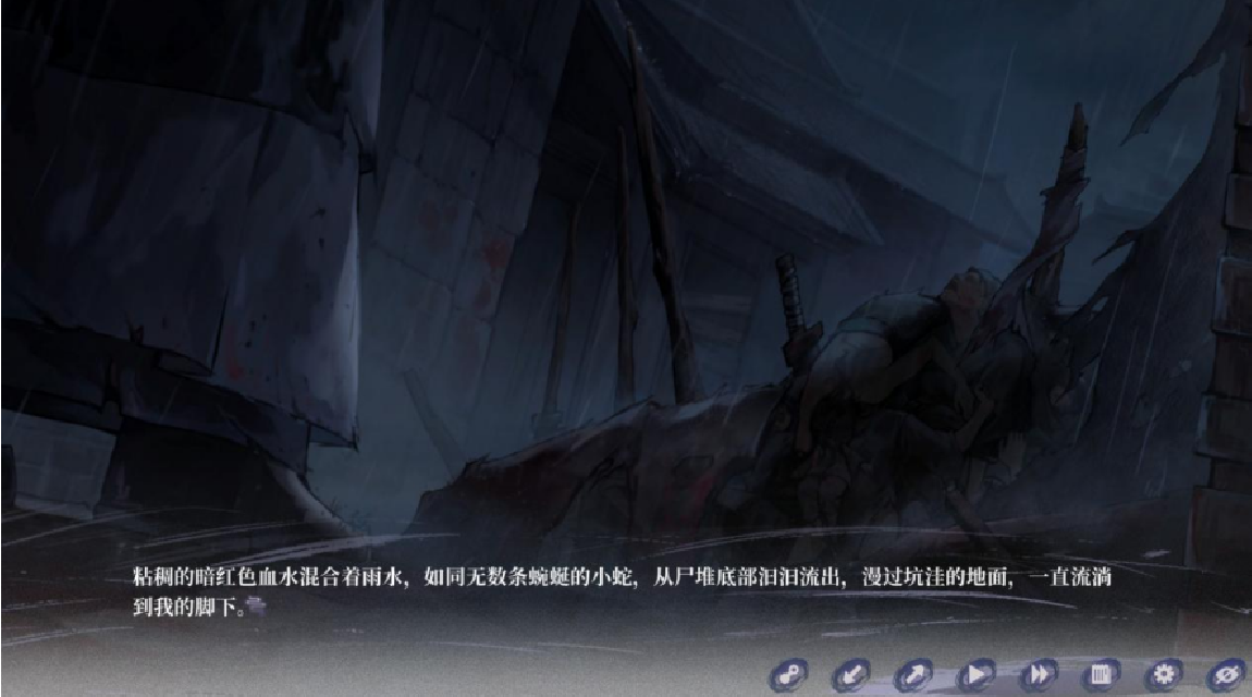 虽然初看之下,《哀鸿》可能确实是一款质量不错的视觉小说游戏,因为在场景描写以及叙事节奏上,嵇零一直都维持着文学性较高的创作功底。比如在游戏讲述“城破十日”的第一个部分中,作者通过插叙的方式合理地在城破的剧情里融入了主角与游戏第一个女主的过往故事。即便本作从这一章节中就略微暴露出了部分角色并不太讨喜的形象设计,其剧情体验还是比较优秀的。