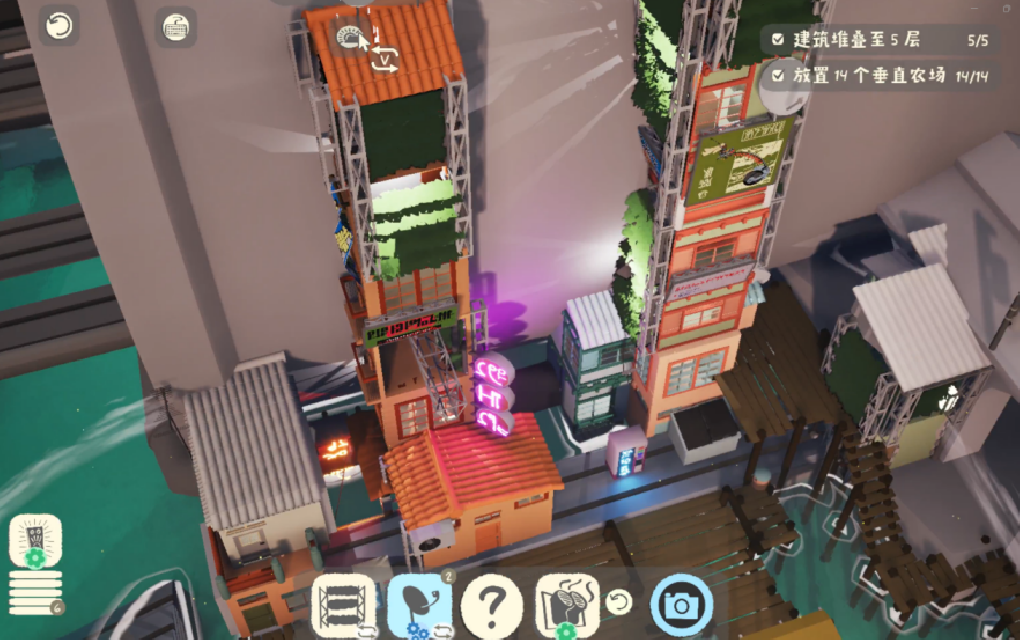 当然游戏也为合理的堆叠方式提供了奖励,甚至还给游戏带来一定的随机性,类似于我们熟知的“开罗游戏系列”,建筑会有相性互搭。部分特殊装修带有特定属性,例如盆栽带有绿色的环保标志,雷达可以作为蓝色的科技服务类,路灯提供直接的橙色光照,满足商店的升级许可要求之后,便能获取一个随机建筑物的奖励。