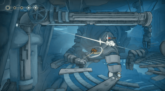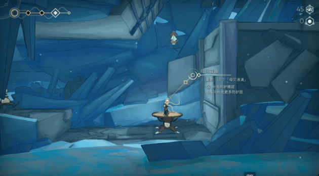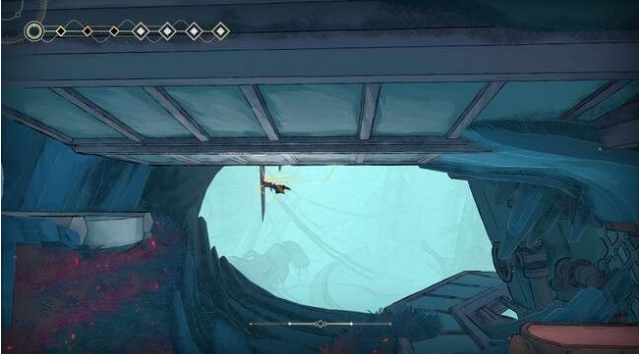 和同类游戏相似,游戏有着能力锁的设定。角色在开局就有了二段跳,不需要另外解锁。随着流程推进能获得闪避、钩锁、滑翔、神行步四种能力。但这游戏没有冲刺,闪避就是单纯的原地无敌帧一下。钩锁、滑翔、神行步三个能力共享一个能量条,而且这能量条一旦使用就持续消耗的,只有落地或者击打能量球才能补充。这导致了在间断跳跳乐里,玩家每次行动在得到补充之前,只能使用一种能力。